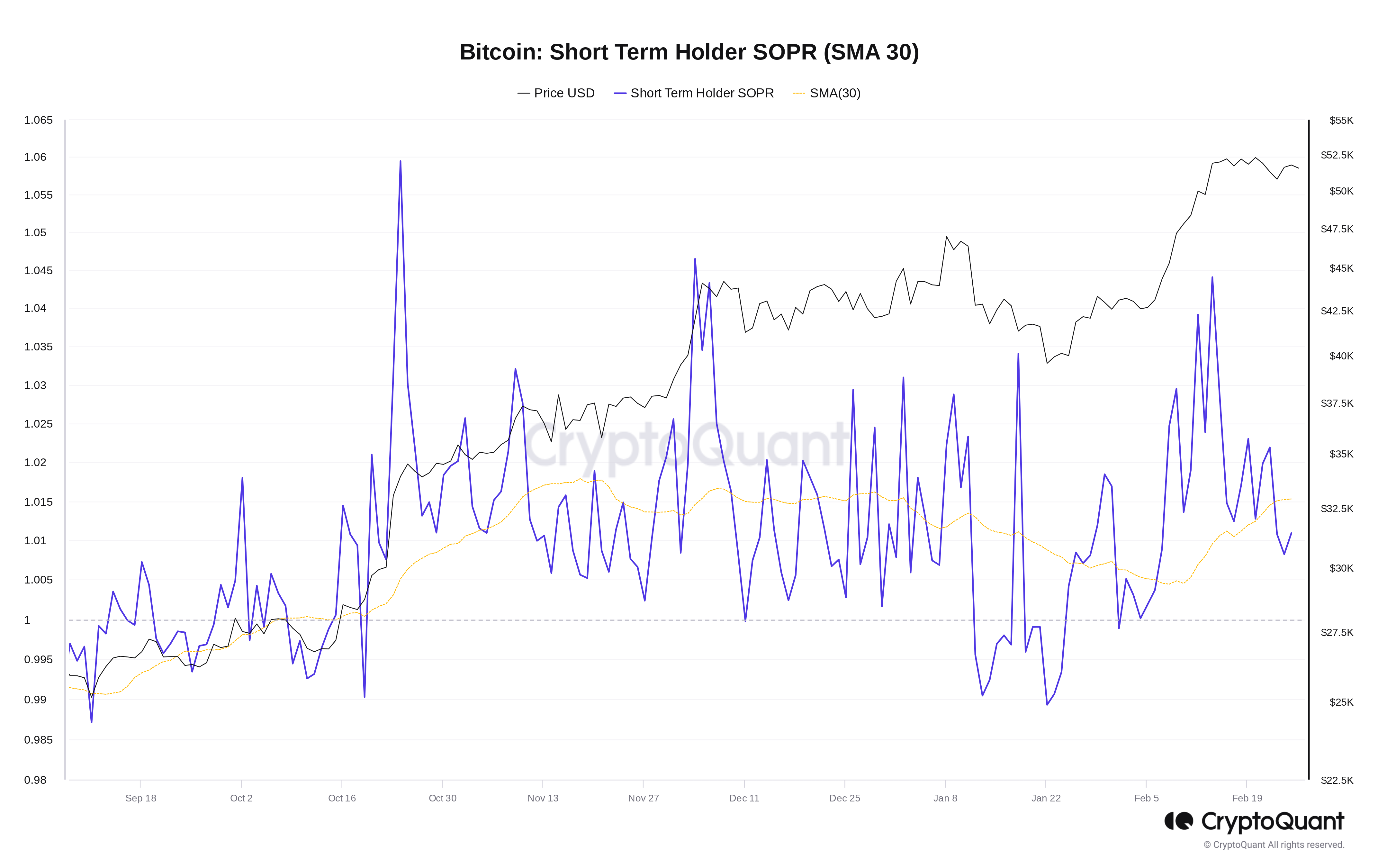 STH-SOPR measures the extent to which STHs — investors hodling BTC for 155 days or less — are in profit versus their purchase price. The metric’s 30-day moving average value hitting local highs has coincided with BTC price retracements.
