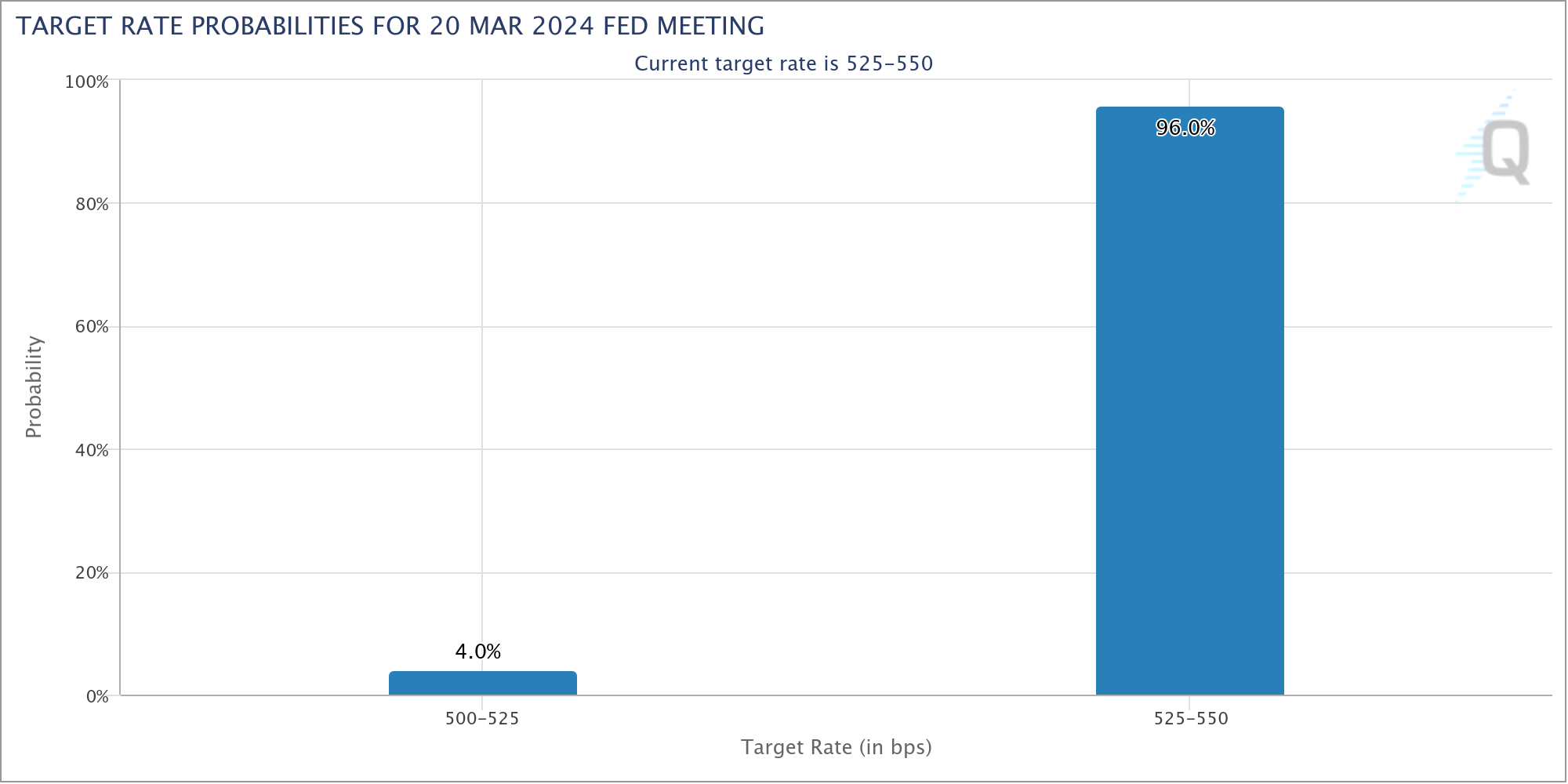 Per data from CME Group’s FedWatch Tool, March currently has just a 4% chance of seeing rates decreasing, with May on 25%.