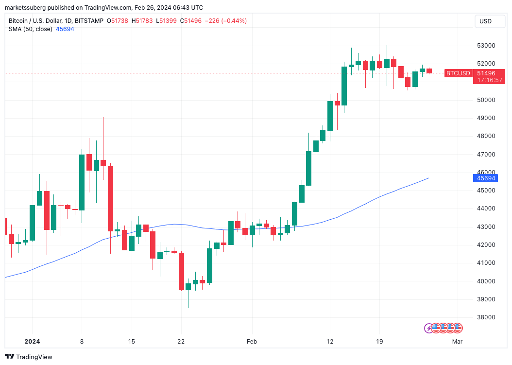 At $51,700, the latest close offered little inspiration to bulls, coming in around $450 lower than previously, data from Cointelegraph Markets Pro and TradingView confirms.