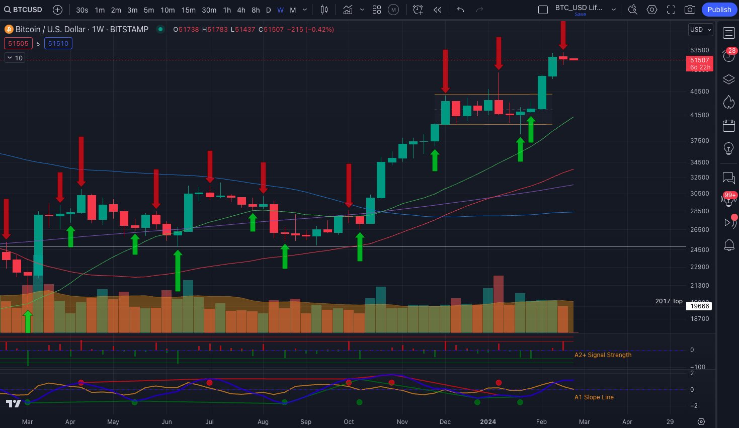 “That’s a red W close for BTC with a new Trend Precognition (down) signal,” it wrote in a post on X (formerly Twitter) about one of its proprietary trading tools.
