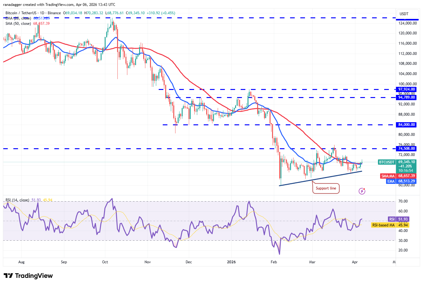 The flattish moving averages and the relative strength index (RSI) near the midpoint do not give a clear advantage either to the bulls or the bears. If the price sustains above the moving averages, the bulls will attempt to drive the BTC/USDT pair above the $72,000 resistance. If they succeed, the BTC price may reach the $74,508 to $76,000 resistance zone.