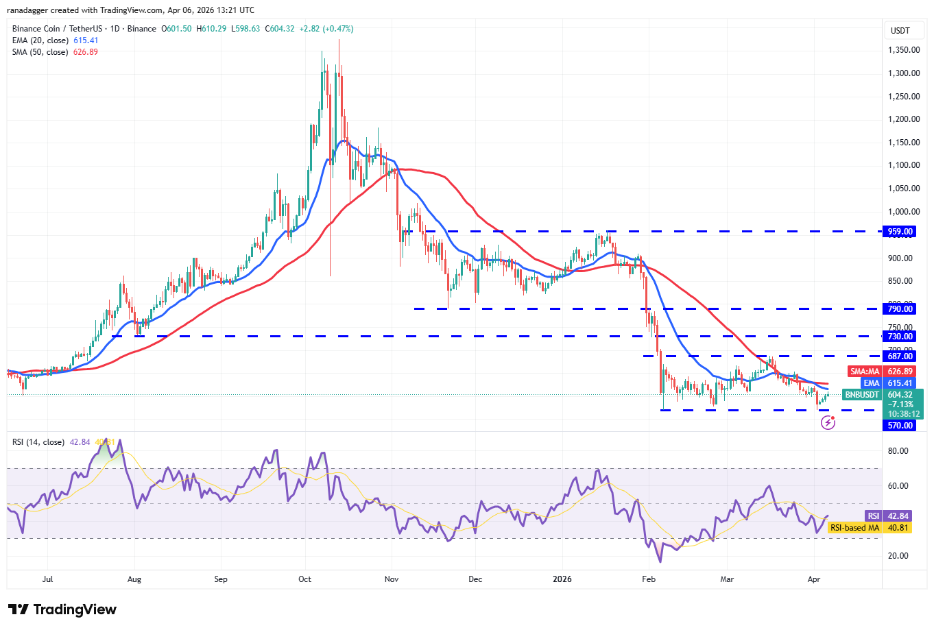 BNB’s (BNB) bounce off the $570 level has reached the moving averages, where the bears are expected to step in.