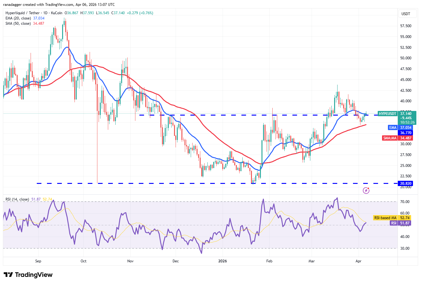 If the HYPE price closes above the 20-day EMA, it suggests that the lower levels continue to attract buyers. The HYPE/USDT pair may then rally to $41.59 and, after that, to the $44 level.