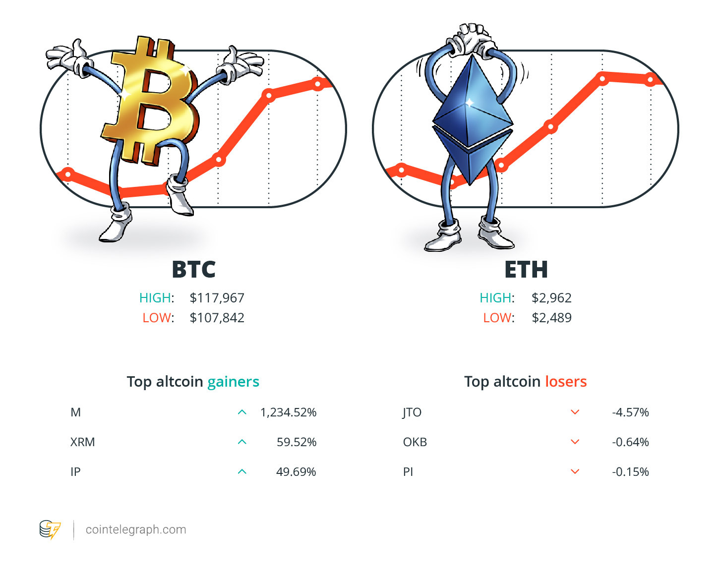 At the end of the week, Bitcoin (BTC) is at $117,967 Ether (ETH) at $2,962 and XRP at $2.78. The total market cap is at $3.68 trillion, according to CoinMarketCap.