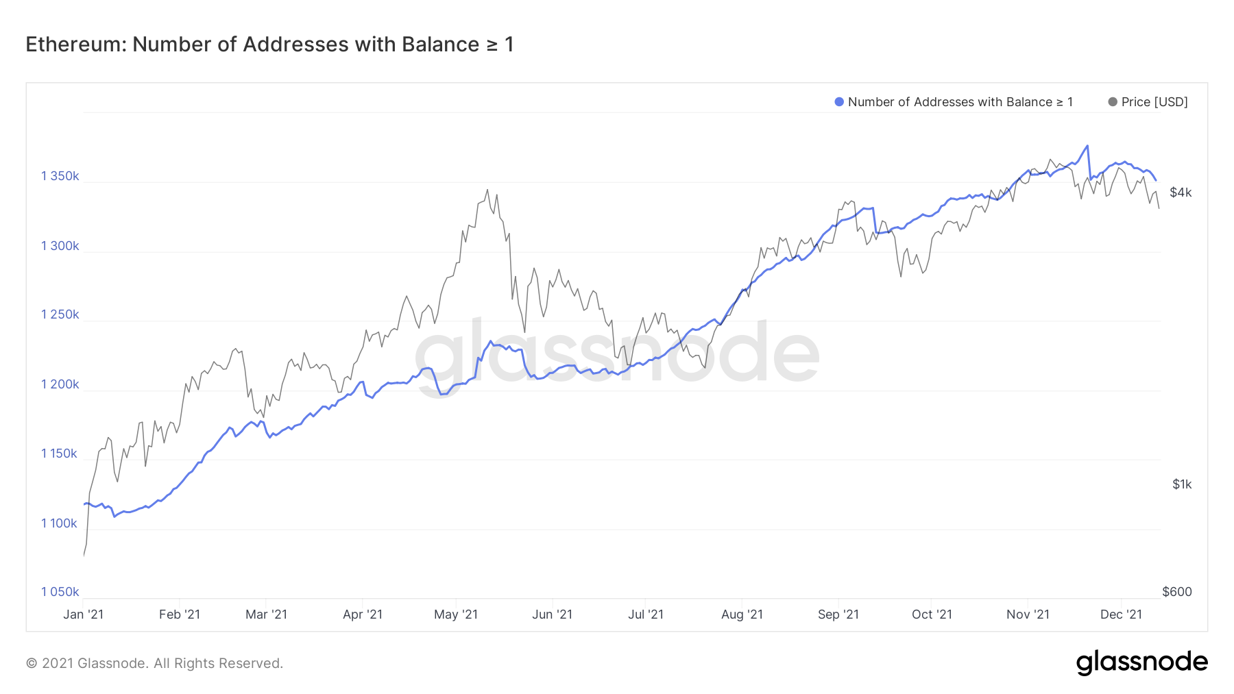 According to knowledge gathered by Glassnode — a blockchain analytics platform, the variety of Ether addresses holding lower than or equal to 0.01 ETH reached a file excessive stage of 19.95 million on Dec. 4, the day ETH dropped to as low as $3,575 (knowledge from Coinbase).