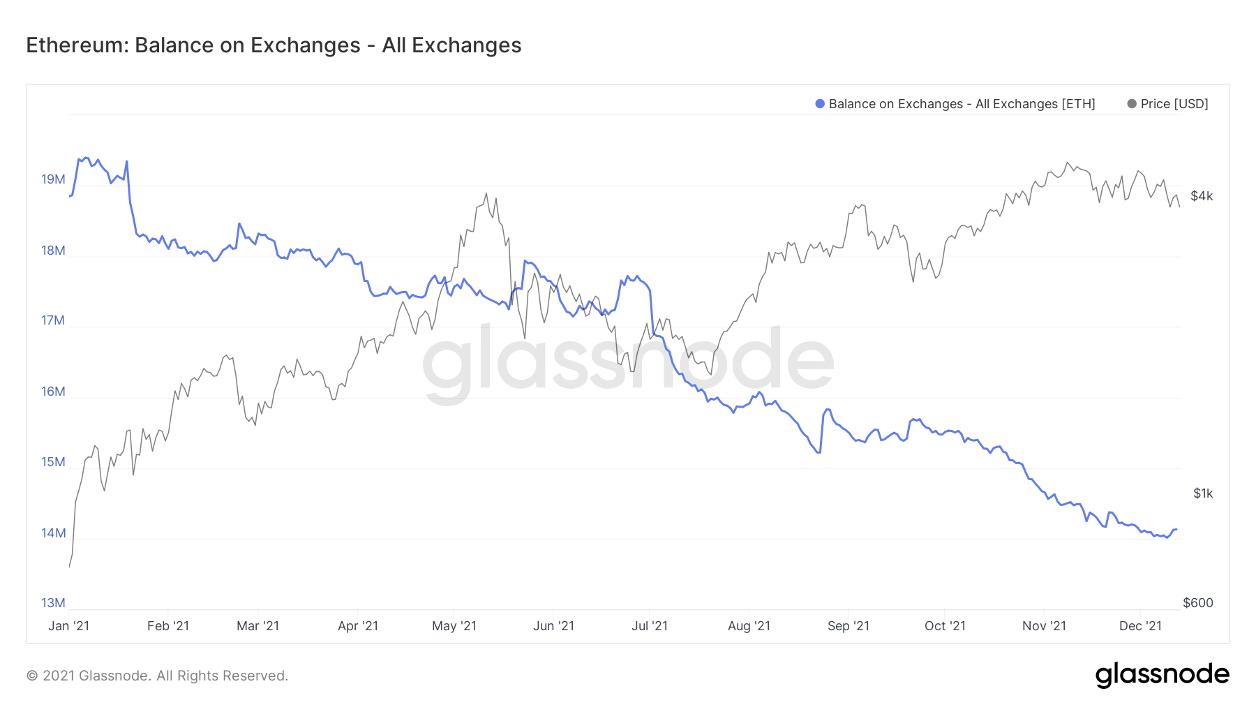 The variety of cash held by exchanges recovered from practically 14 million ETH to 14.13 million ETH since Dec. 9 — which coincided with an virtually 10.50% worth drop — however its long-term development stays skewed to the downside.