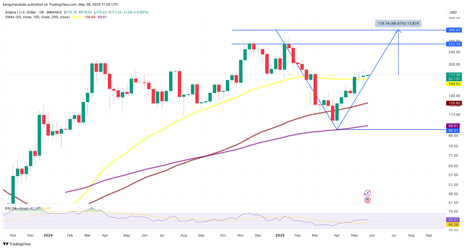 Beyond that, the next target would be the all-time high above $295, representing a 66% increase from the current price.