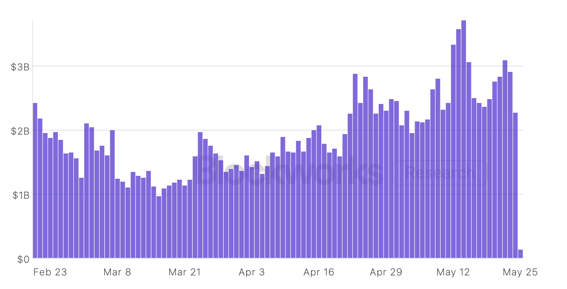 The total value locked (TVL) on the Solana blockchain has increased by over 54% to $9.44 billion on May 26 from multimonth lows of $6.12 billion on April 7. It’s also up by almost 20% over the last 30 days.