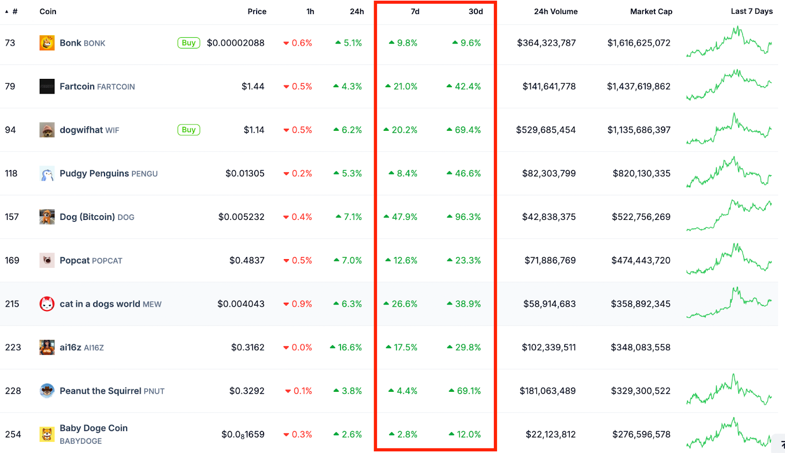 Most Solana-based memecoins have posted double-digit daily losses in the weekly and monthly timeframes, as shown in the figure below. A majority of these tokens are 50% to 80% from local lows.