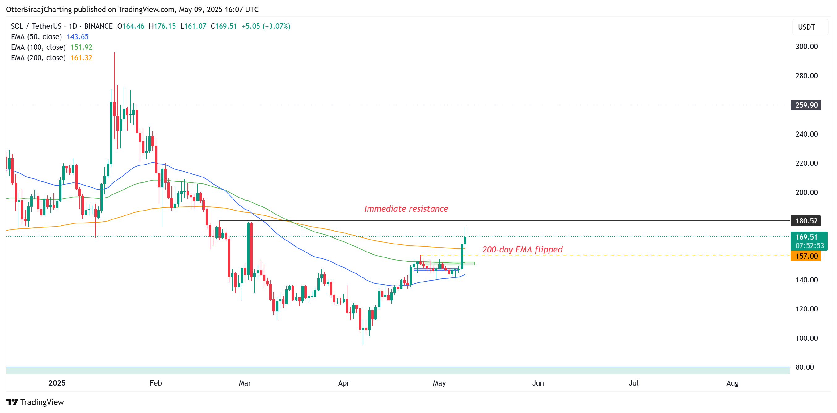 The daily chart bolsters this narrative. Solana recently closed above the 200-day EMA, with immediate resistance at $180. A break above this level in the coming weeks and turning the range into a support level could potentially ignite a parabolic rally by Q3 2025.