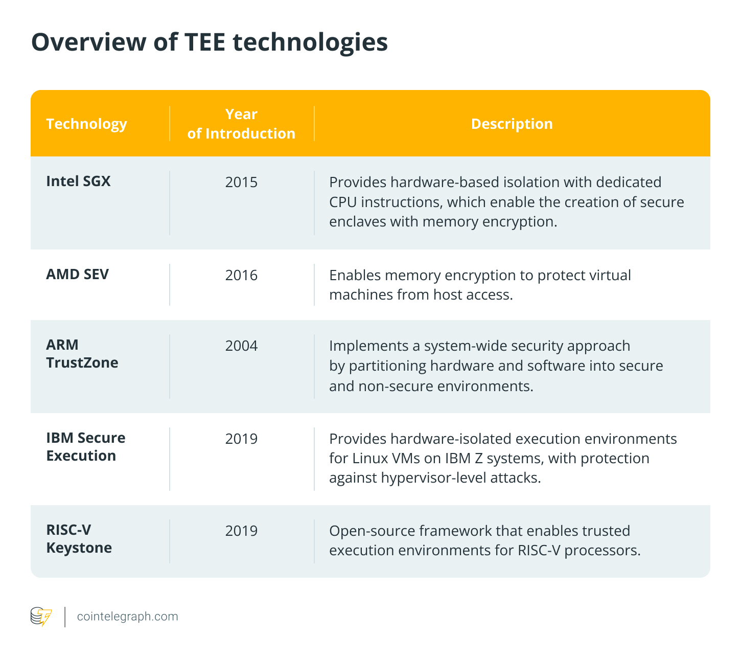 Amid growing interest in practical ways to scale and safeguard blockchains, hardware‑based approaches are coming into focus. The role of Trusted Execution Environments (TEEs) in blockchain systems has gradually expanded from privacy-preserving projects to applications that improve scalability and enable secure offchain computation. Currently, over 50 teams are working on TEE-based blockchain projects. In this article, Cointelegraph Research explores the technical foundations of TEEs in blockchain systems and examines key use cases of this technology.