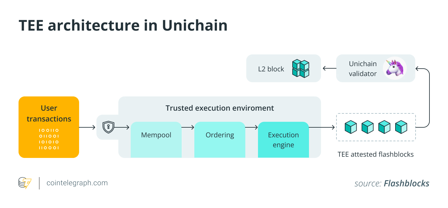 Trusted execution environments can also be used to provide an MEV-proof blockchain infrastructure. Unichain, an optimistic rollup on Ethereum developed by the Uniswap team and launched in October 2024, leverages TEEs in its block-generation process. Its block builder, developed in collaboration with Flashbots, uses TEEs to construct blocks within a protected enclave.