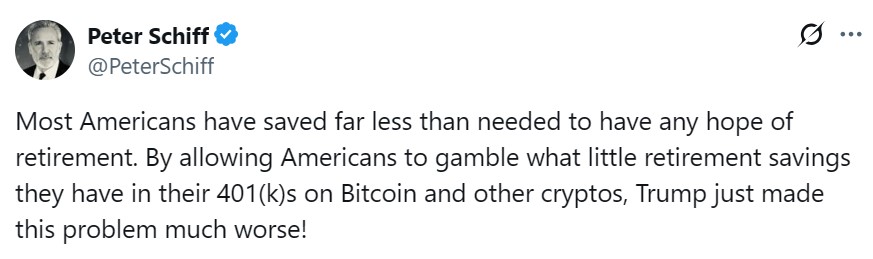 Not everyone in the financial world welcomed the news. Gold advocate and crypto critic Peter Schiff warned that the development could worsen what he sees as a dire retirement savings gap in the US.
