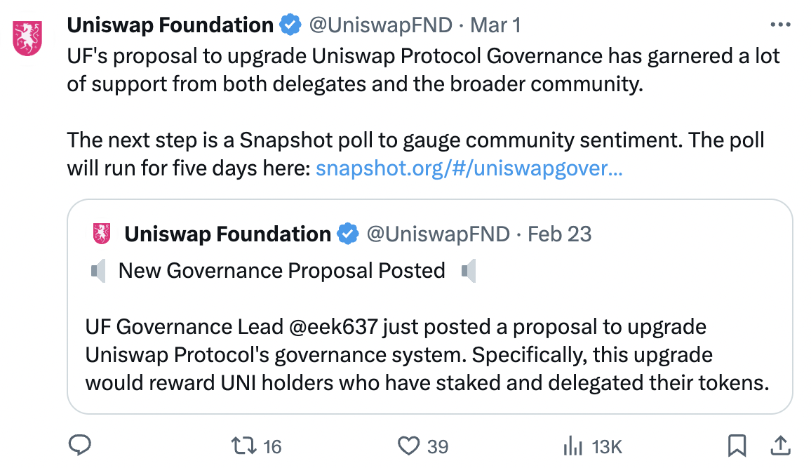 The Uniswap Foundation announced this earlier in a Feb. 23 post on X, saying that the “upgrade would reward UNI holders who have staked and delegated their tokens.”