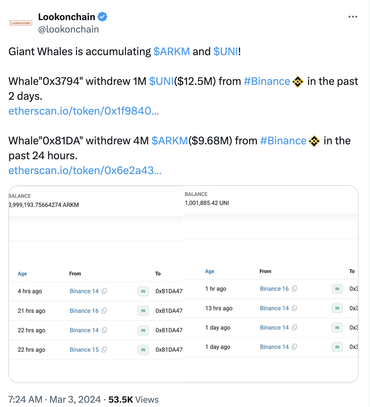 Data from blockchain analytics platform Lookonchain shows that a whale accumulated UNI tokens worth more than $12.5 million over the previous 48 hours.