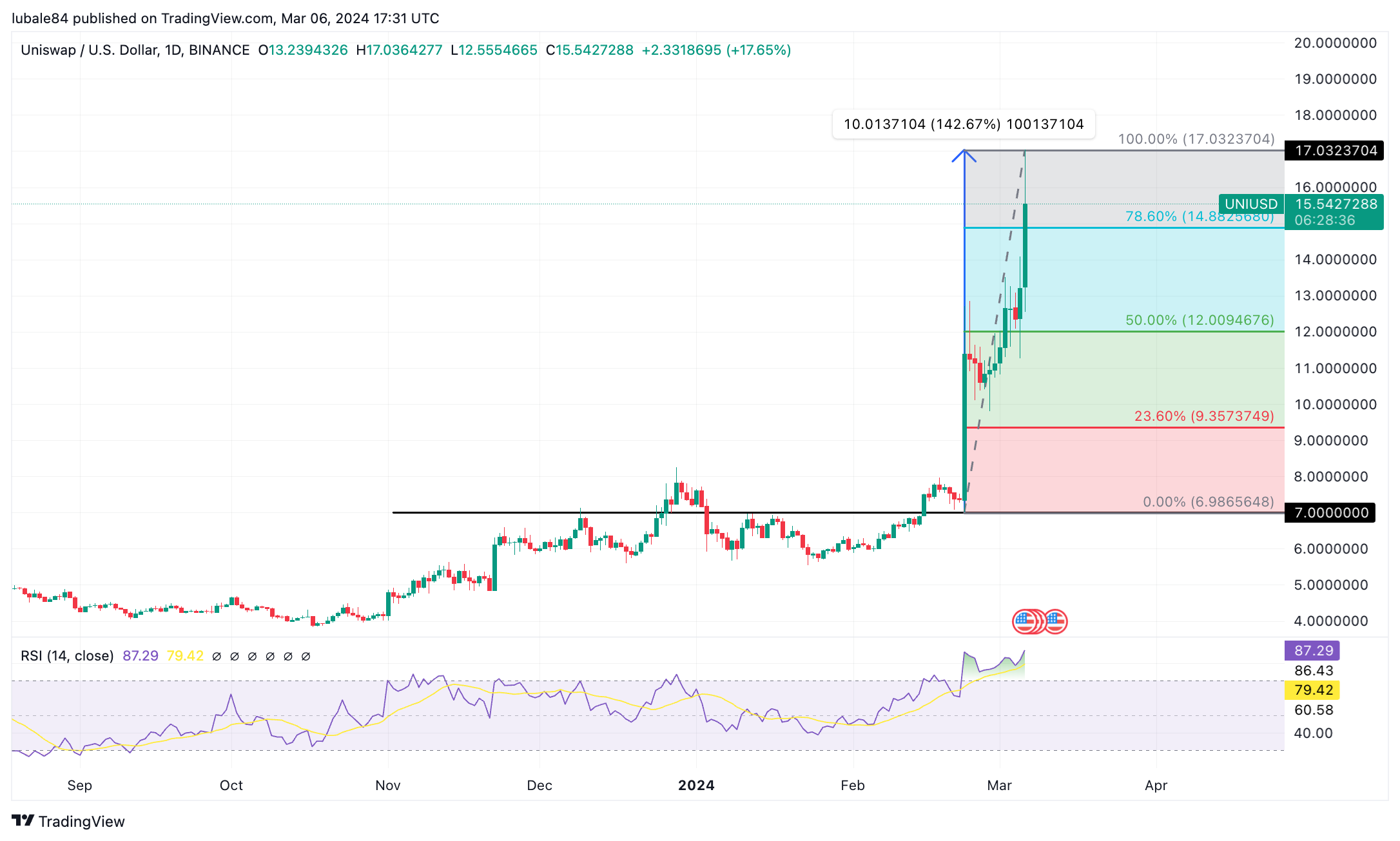 UNI jumped over 143% from a low of $7 on Feb. 23 to reach an intraday high of $17.03 on March 6, according to data from Cointelegraph Markets Pro and TradingView.