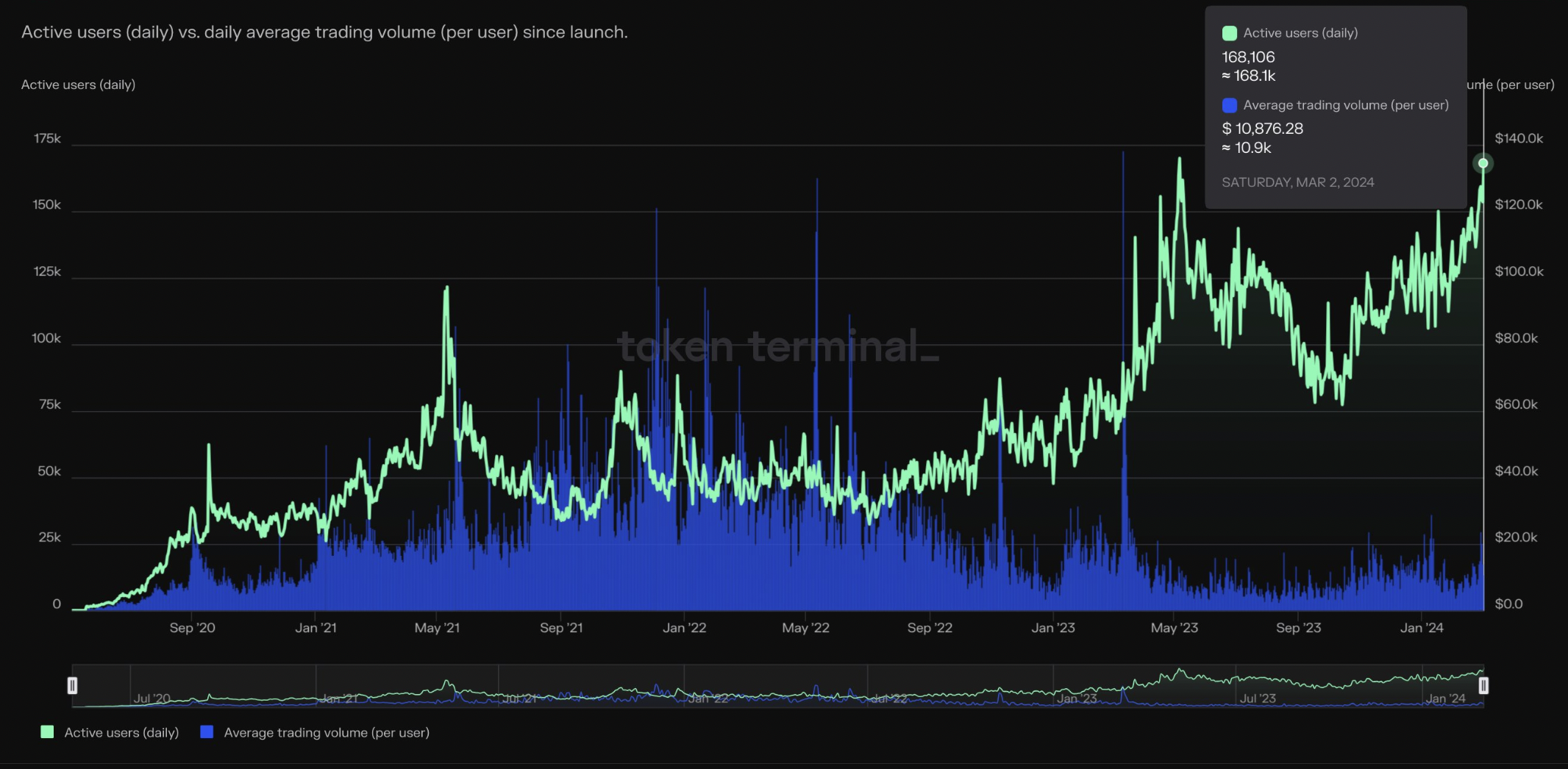More data from Token Terminal shows an increase in Uniswap’s network activity. According to the chart below, the number of daily users increased from around 75,000 in October 2023 to 168,106 on March 2.