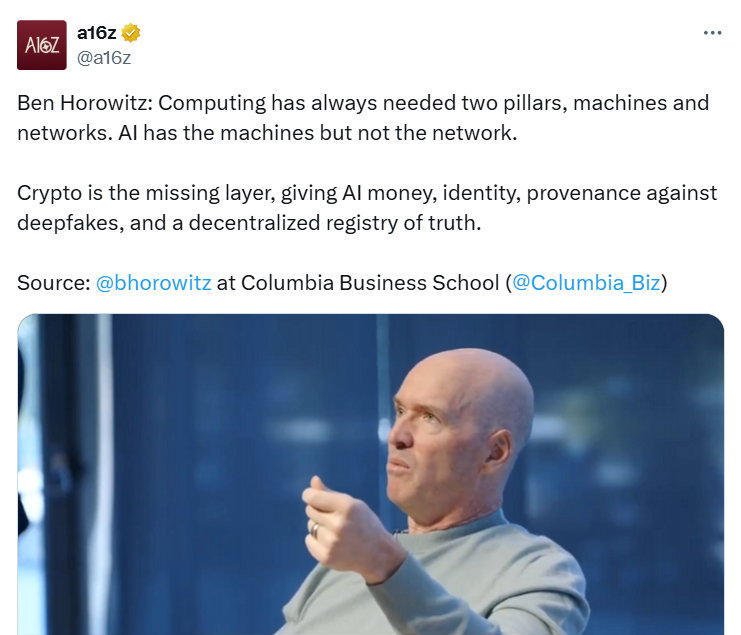 “If you’re an AI, you’re not allowed to have a credit card,” said Horowitz in a Tuesday X post. “Crypto is like the economic network for AI,” he added.