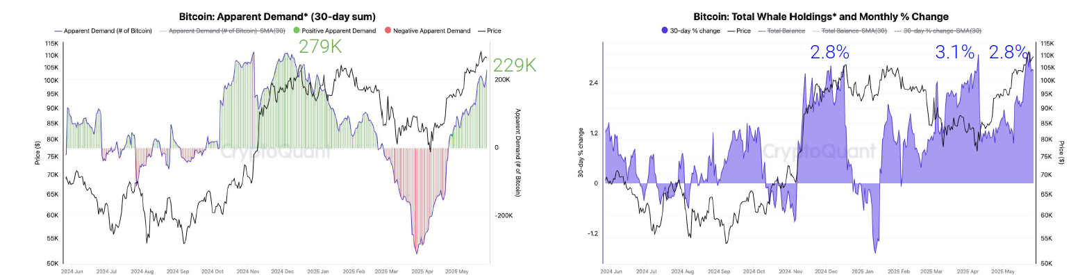 According to the report, Bitcoin’s 30-day demand growth reached 229,000 BTC on May 28, near the previous demand growth peak of 279,000 BTC, marking the market top in December 2024.