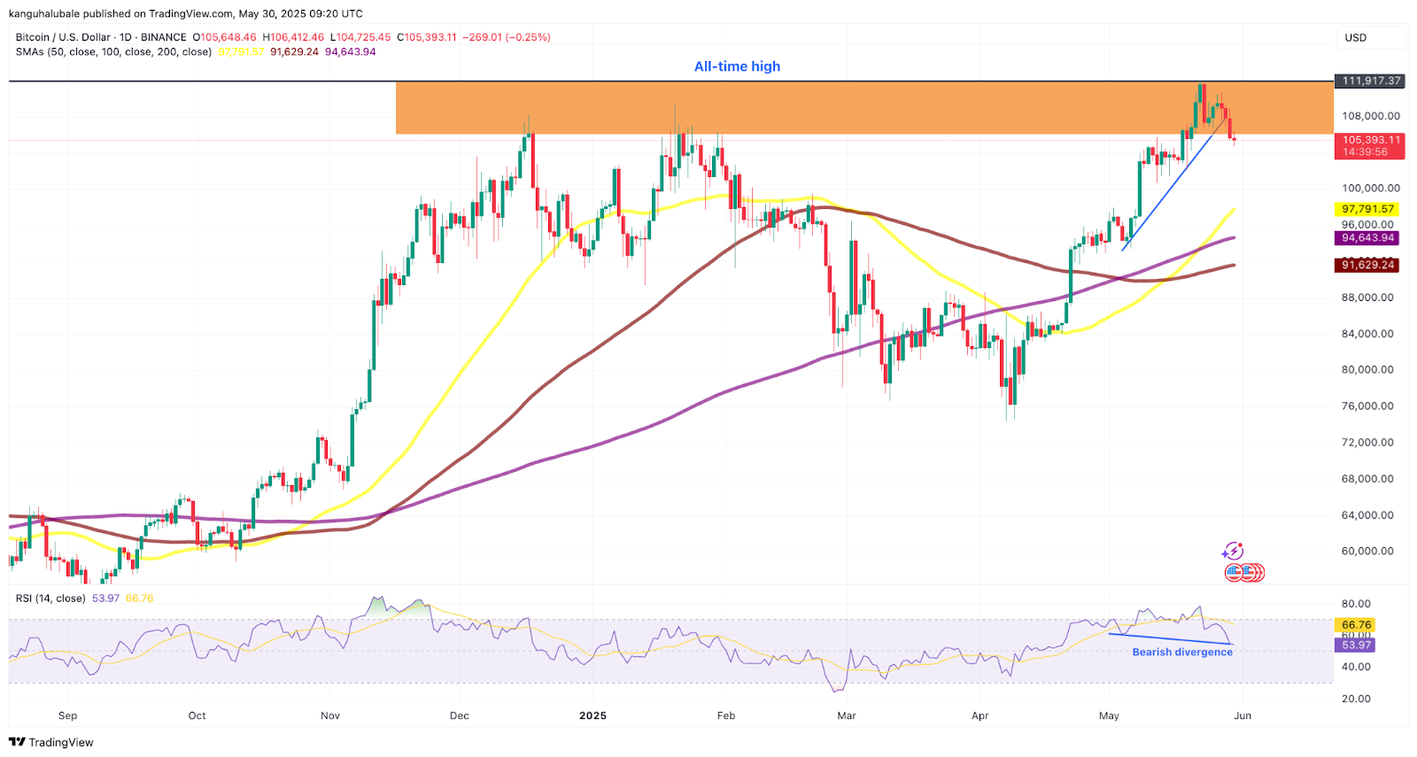 Bitcoin’s bearishness on May 30 is preceded by waning demand for the asset following its run to all-time highs above $111,000.