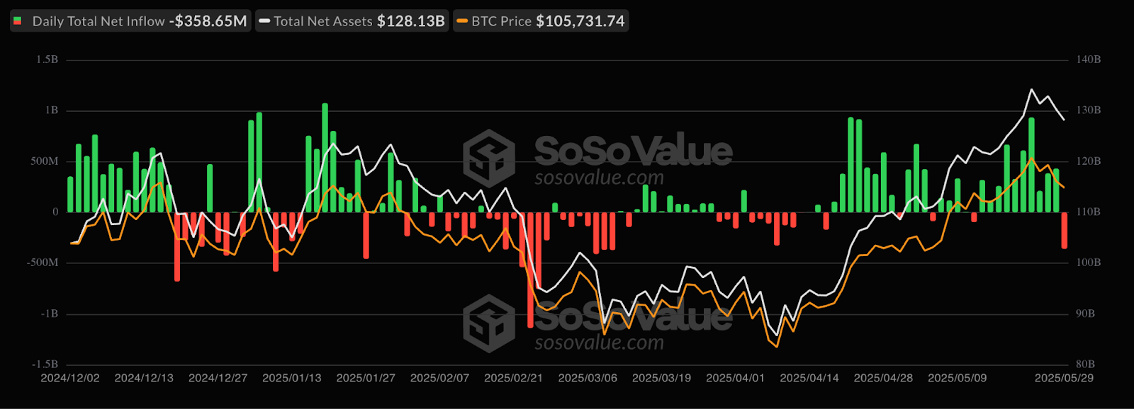 On May 29, the spot BTC ETFs saw a massive $358.65 million in outflows, ending a 10-day streak of inflows.