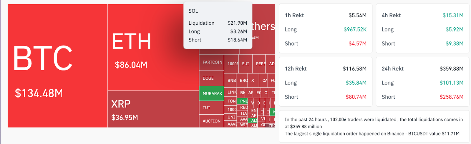 The crypto futures market witnessed the liquidation of over $359 million worth of leverage positions in the last 24 hours, with $258.7 million being short liquidations.