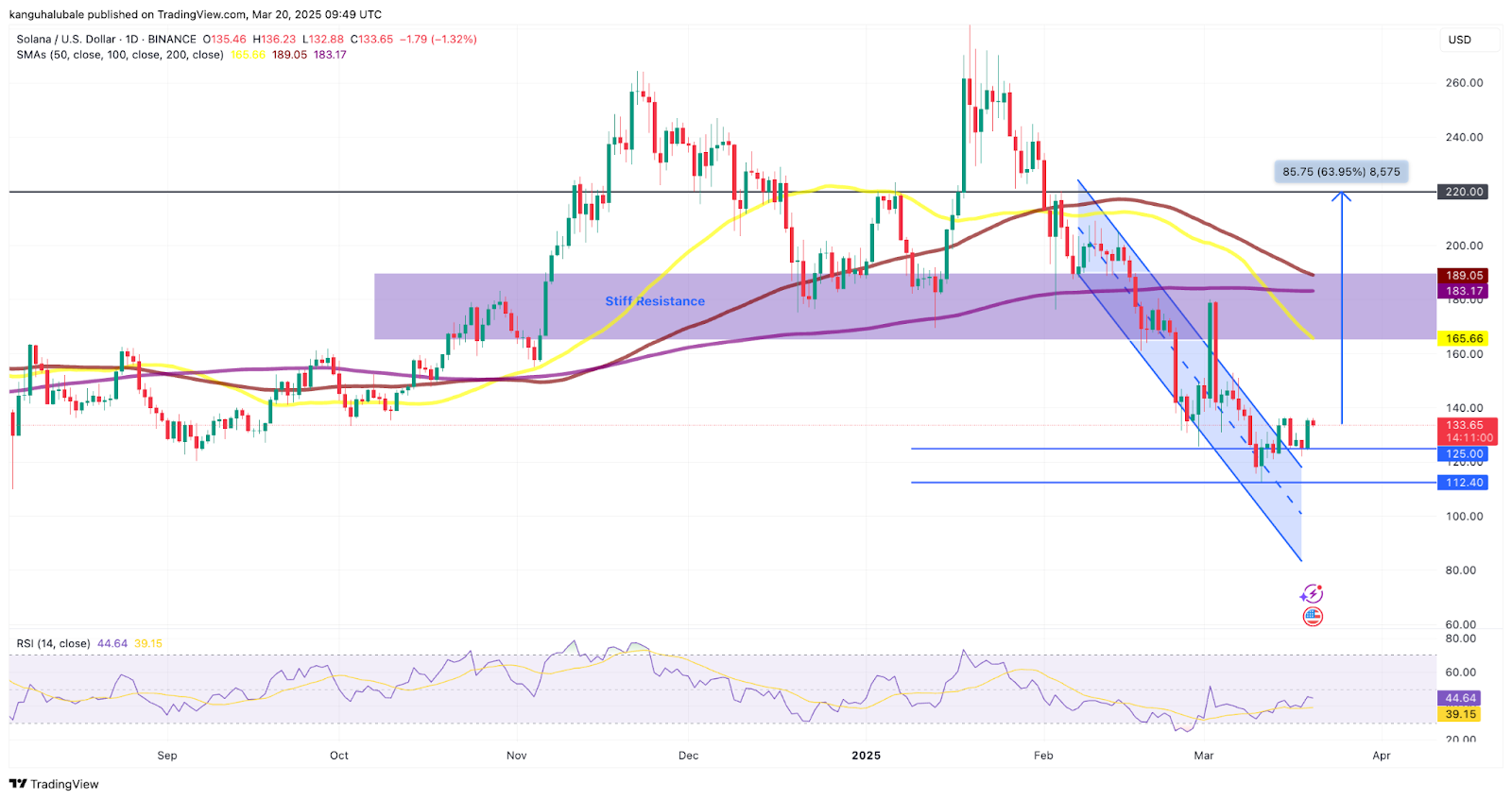 SOL still trades well below its range high of $220 reached on Feb. 5. However, the bulls have established support around $110 and $125 at the upper boundary of a descending channel.